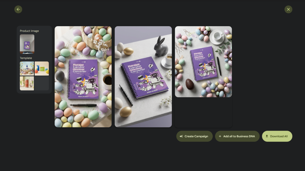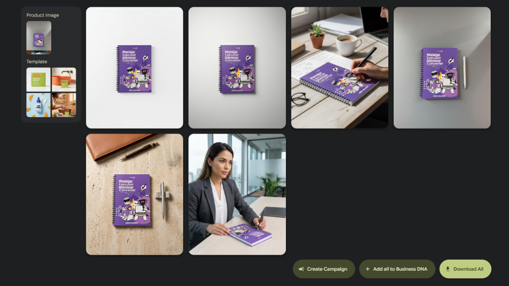 A partir de uma foto simples do nosso planner físico, o Poemlli transforma em múltiplos contextos de estúdio e estilo de vida, garantindo profissionalismo e consistência de marca. Imagem: Reprodução/Divulgação.